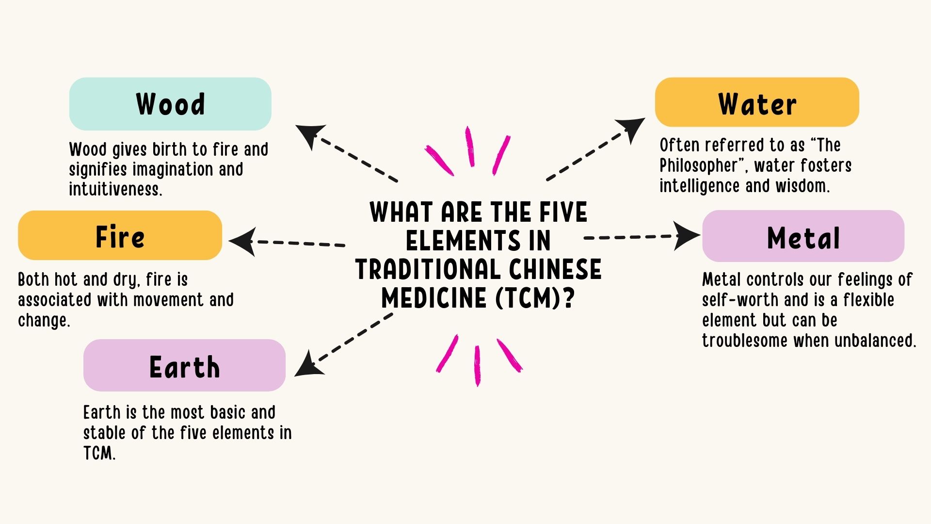 According to tradition, everything in the universe is based in Five Element Theory. We can use it to explain how we’re influenced by the world around us and how our internal body parts work in combination. The five elements in TCM are: