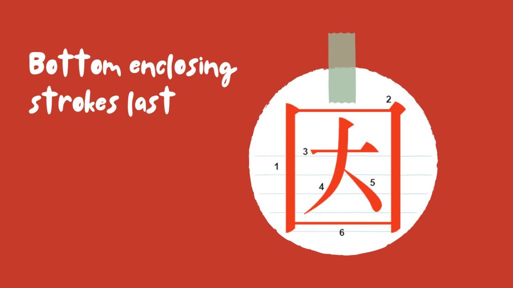 When closing off a square within a character, the final enclosing line is drawn last. In characters like 因 (yīn – cause), the bottom horizontal stroke is drawn last to complete the character. So the final stroke is written from left to right (line 6 in the below diagram), after all the enclosed contents have been completed.